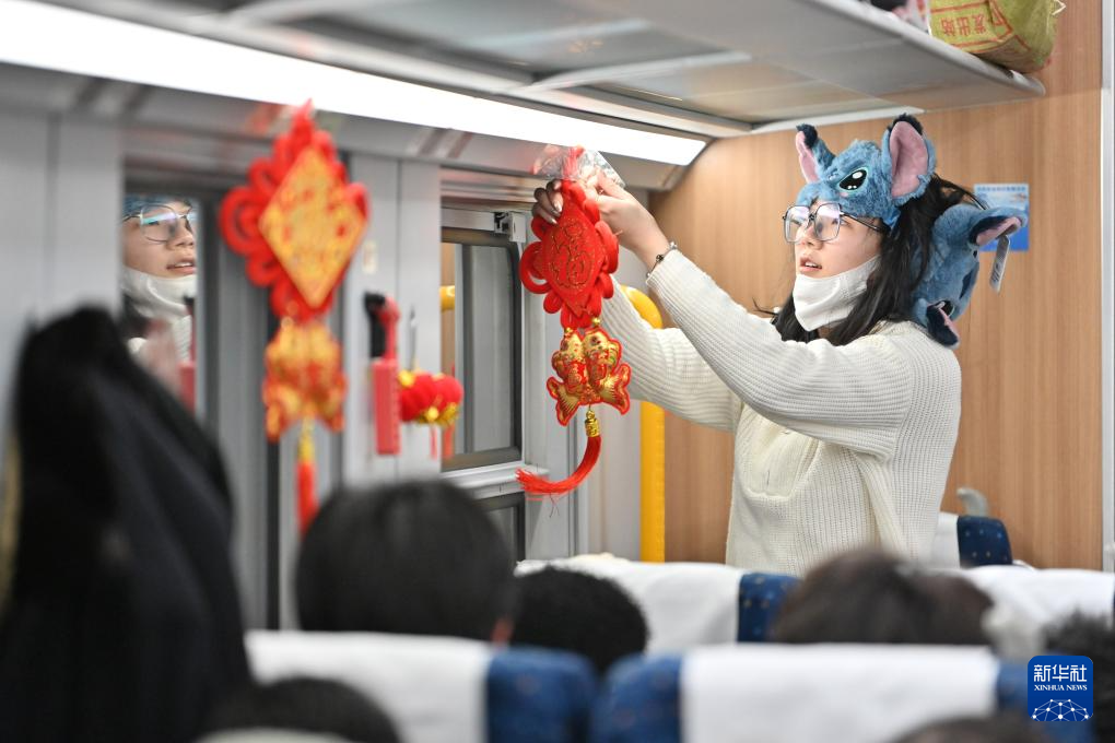 2月3日,在D59次列车上,一名小姑娘将中国结粘牢。