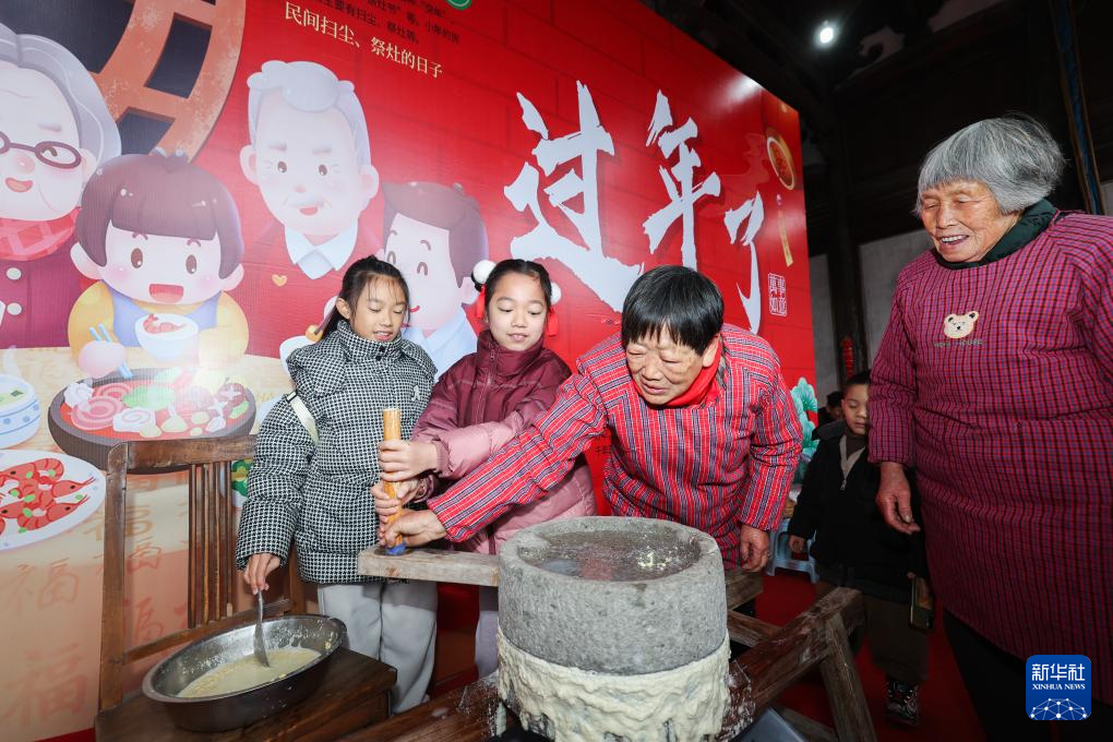 2月3日,这是东白湖镇斯宅村新谭家老台门古民居内民俗迎春活动上的手工磨豆腐。