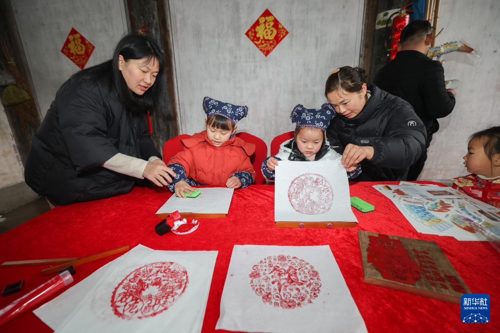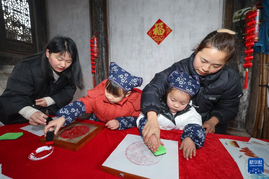 2月3日,当地村民在东白湖镇斯宅村新谭家老台门古民居内民俗迎春活动上体验拓印年画。