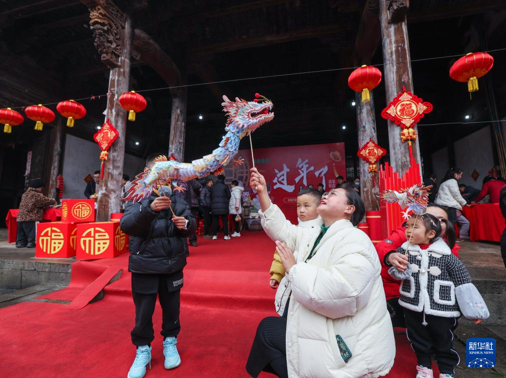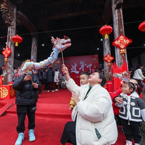2月3日,小朋友们在东白湖镇斯宅村新谭家老台门古民居内民俗迎春活动上体验舞龙灯。