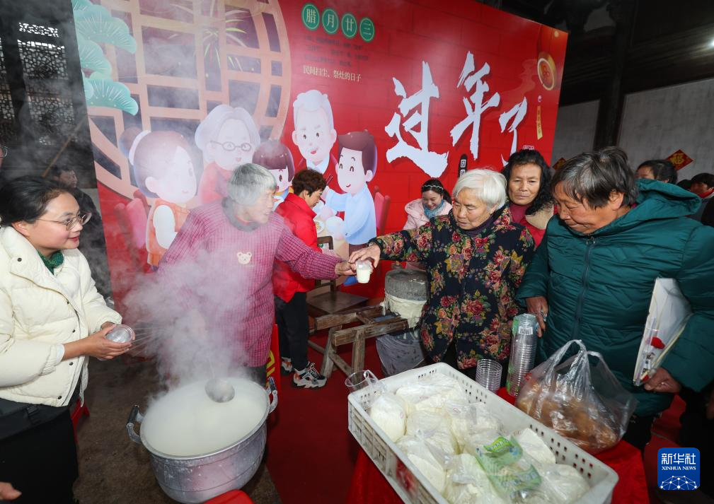 2月3日,在东白湖镇斯宅村新谭家老台门古民居内民俗迎春活动上,游客和村民们在品尝现磨豆浆。