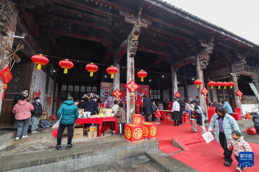 这是2月3日在东白湖镇斯宅村新谭家老台门古民居内拍摄的民俗迎春活动现场。