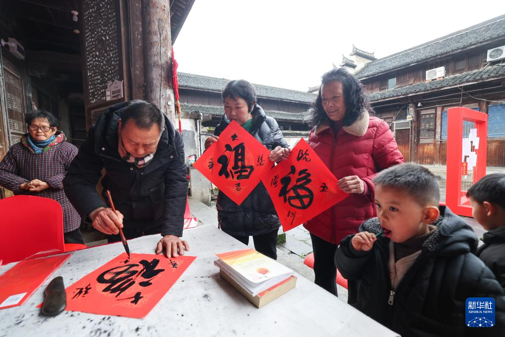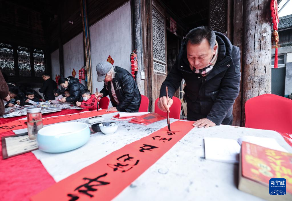 2月3日,书法爱好者在东白湖镇斯宅村新谭家老台门古民居内民俗迎春活动上写春联、送福字。