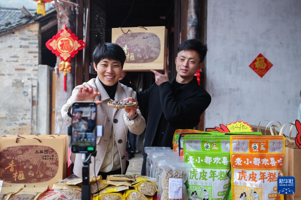 2月3日,在东白湖镇斯宅村新谭家老台门古民居内民俗迎春活动上,东白湖镇村书记赵坚均(右)和主播在进行直播带货,推荐东白湖镇特色产品,如茶叶、香榧、粉丝、藤羹等。