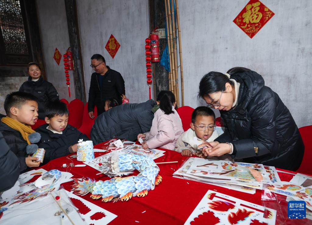 2月3日,小朋友们在东白湖镇斯宅村新谭家老台门古民居内民俗迎春活动上做龙灯。
