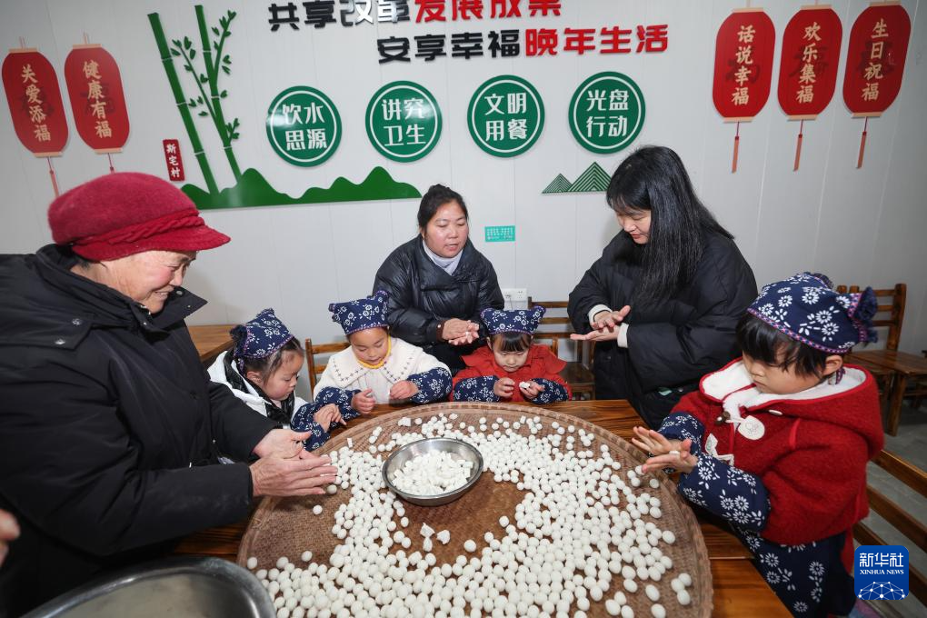 2月3日,在东白湖镇斯宅村的爱心食堂内,小朋友们在家长的带领下和老人们一起做汤圆、迎新春。