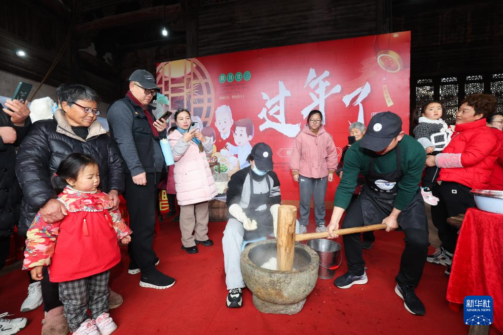 2月3日,这是东白湖镇斯宅村新谭家老台门古民居内民俗迎春活动上的打麻糍。