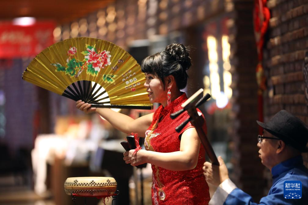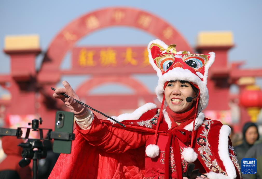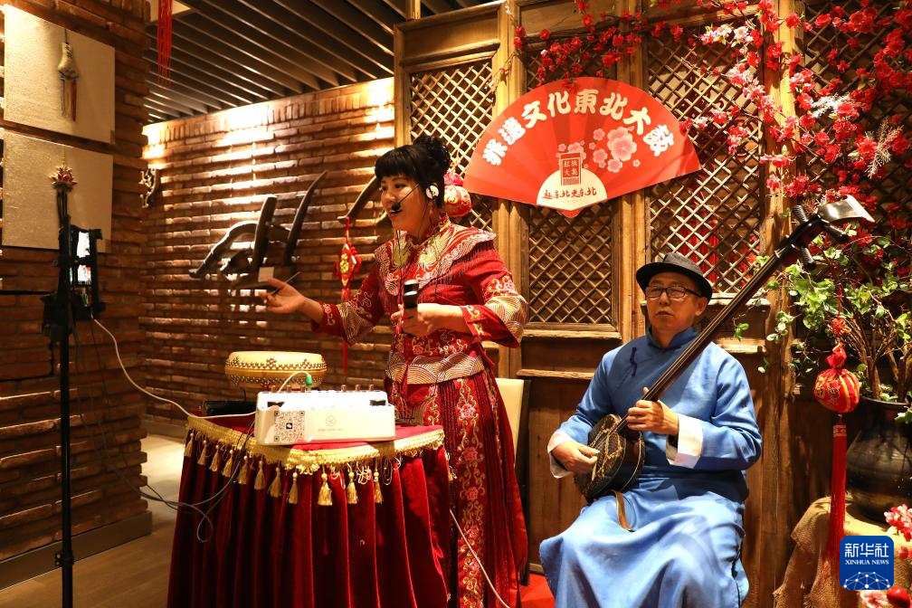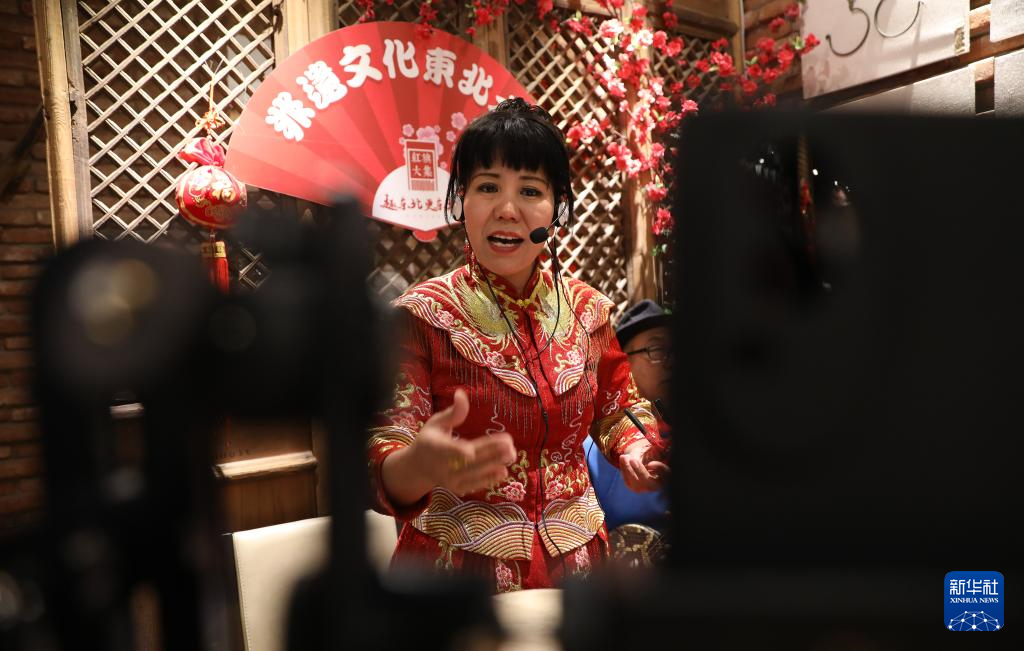 2月1日,王艳娟在辽宁省营口市鲅鱼圈万隆广场表演东北大鼓,同步进行手机直播,让更多人看到传统文化的魅力。
