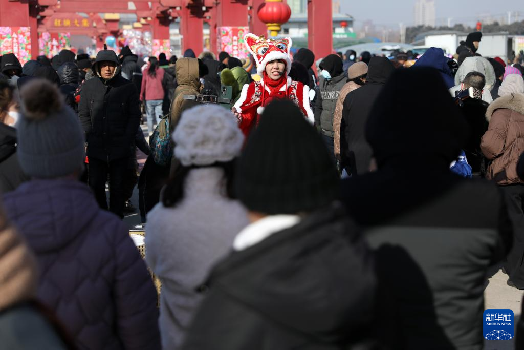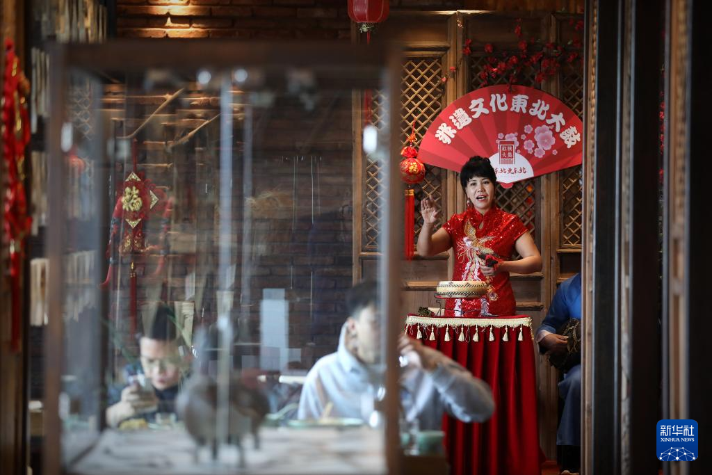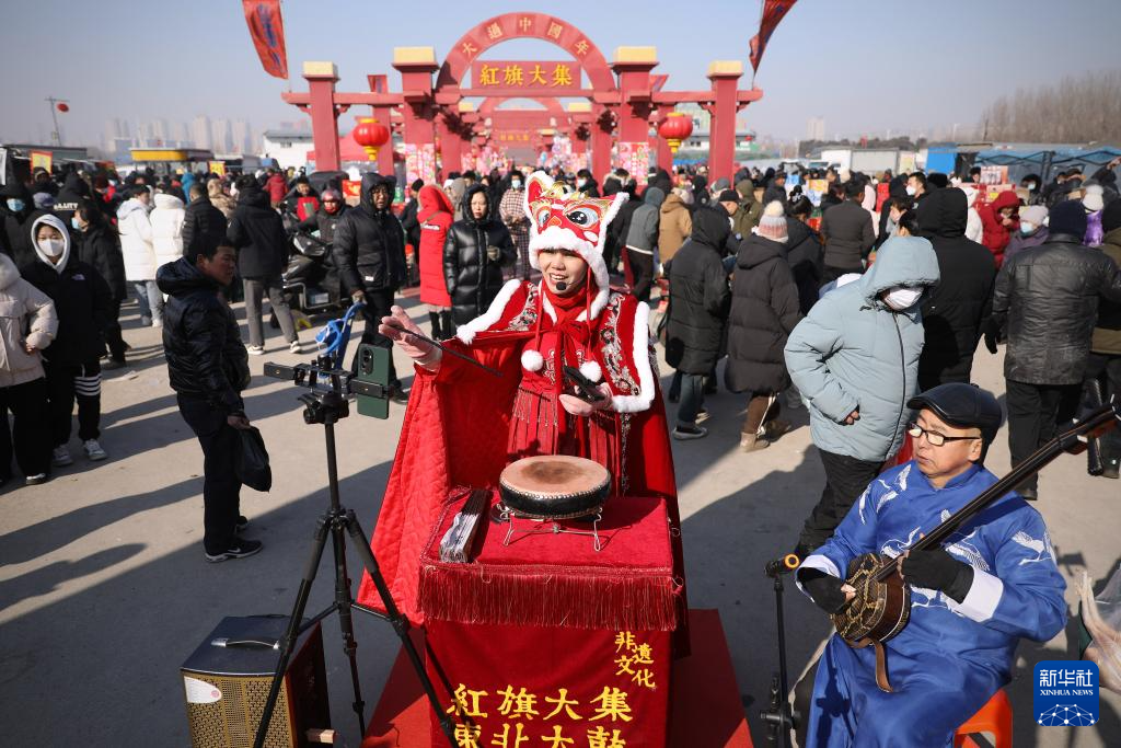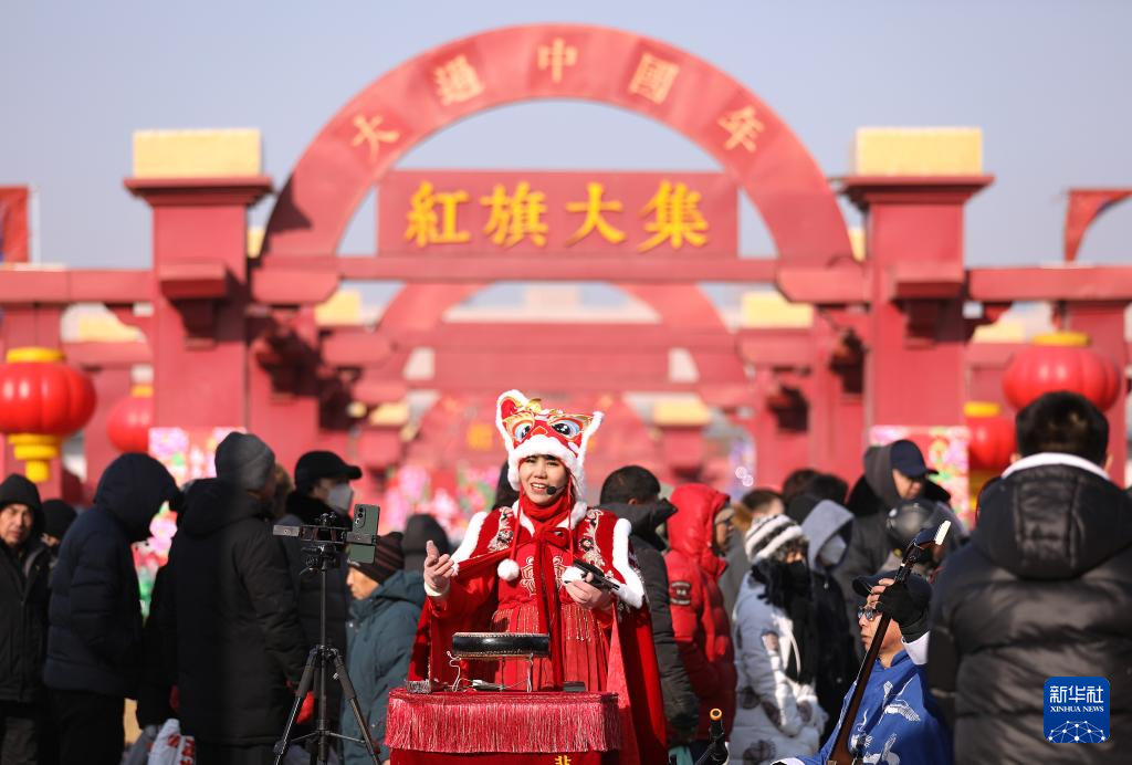 2月2日,王艳娟在辽宁省营口市鲅鱼圈红旗民俗大集上表演东北大鼓(无人机照片)。