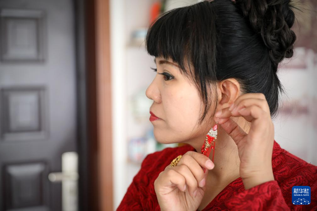 2月1日,王艳娟在自己家中戴上耳饰,准备出发演出。