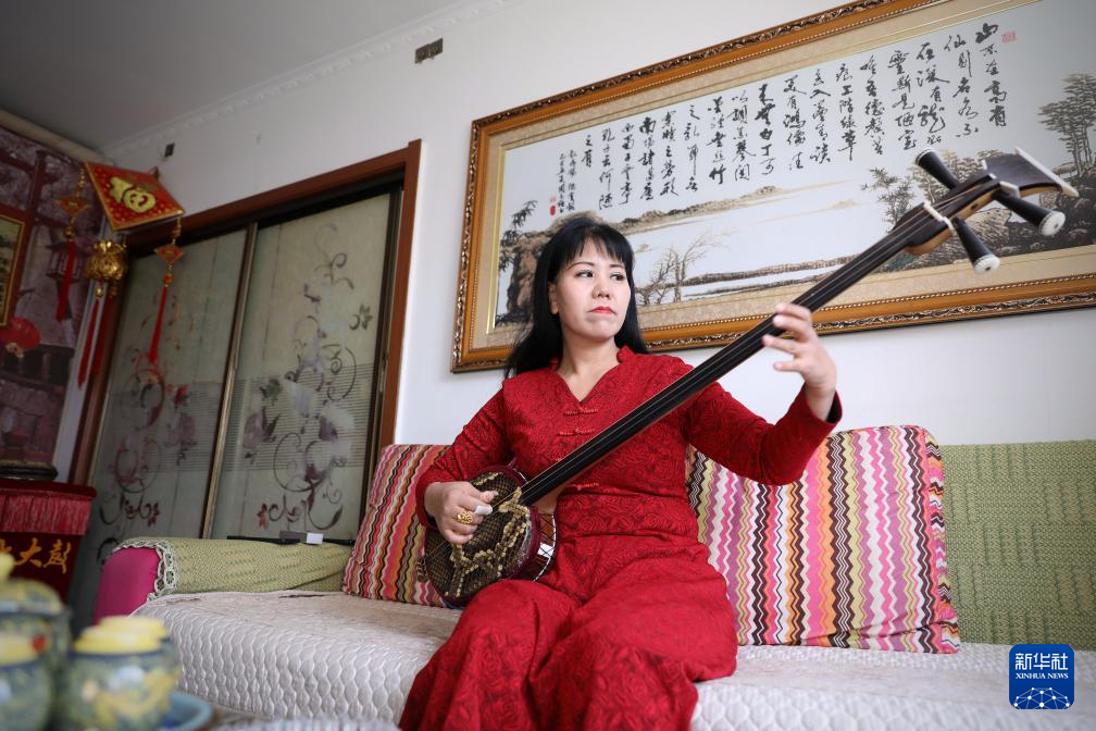 2月1日,王艳娟在自己家中练习三弦演奏。
