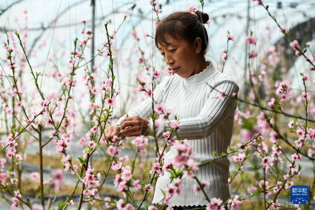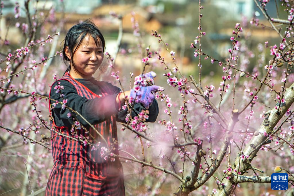 2月4日,农民在云南省文山壮族苗族自治州文山市马塘镇珍珠蜜桃基地疏花。