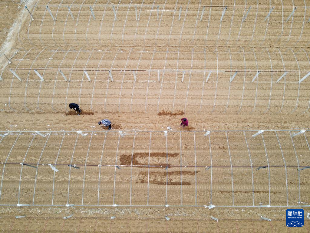 2月4日,山东省滨州市惠民县何坊街道农民在移栽西瓜苗。