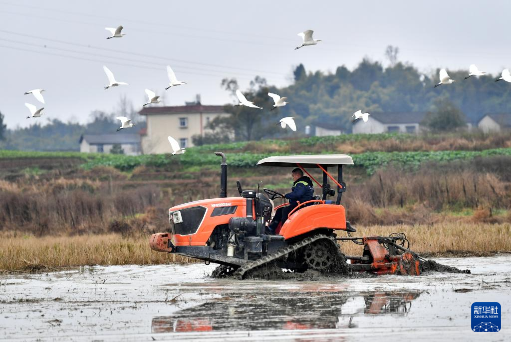 2月4日,江西省樟树市义成镇乌塘村村民驾驶农机翻整田地,为播种做准备。