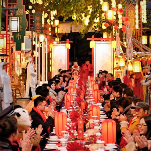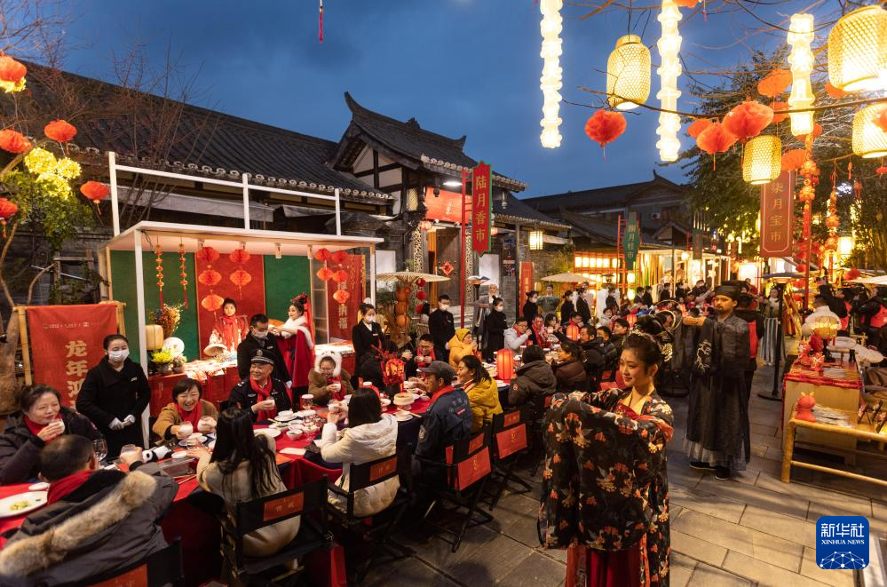 当日,有成都“城市会客厅”之称的宽窄巷子举行“在成都,遇见中国年—— 十二月市年夜饭 温暖幸福年”活动,环卫工人、快递小哥、大运会志愿者、高新技术人才、国际友人等48位嘉宾欢聚12桌“家宴”,在民俗表演中享美食、迎新春。