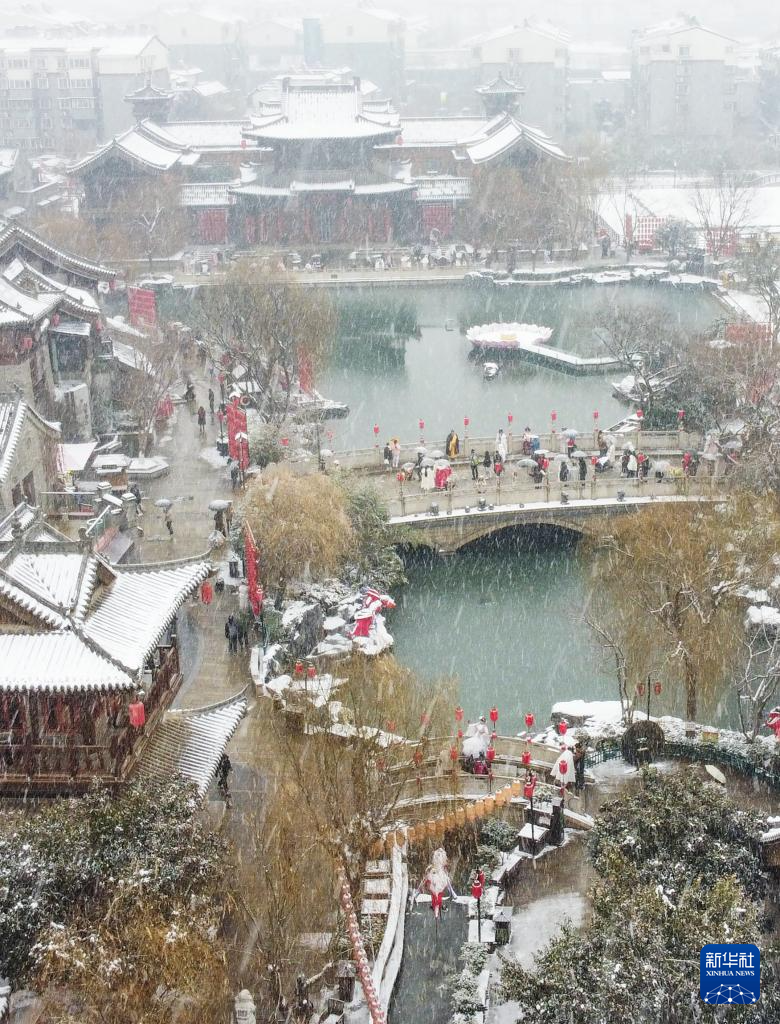 2月3日,游人在河南洛阳市古城历史文化街区洛邑古城景区参观游览(无人机照片)。