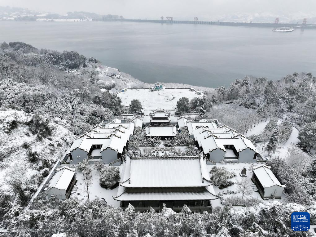 2月4日拍摄的湖北省宜昌市秭归县屈原故里文化旅游区古建筑群雪景(无人机照片)。