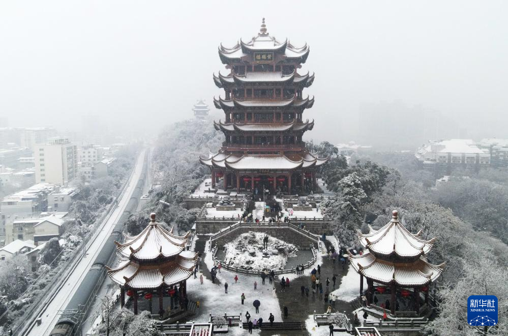 2月4日,游客在雪中的湖北省武汉市黄鹤楼公园游玩(无人机照片)。