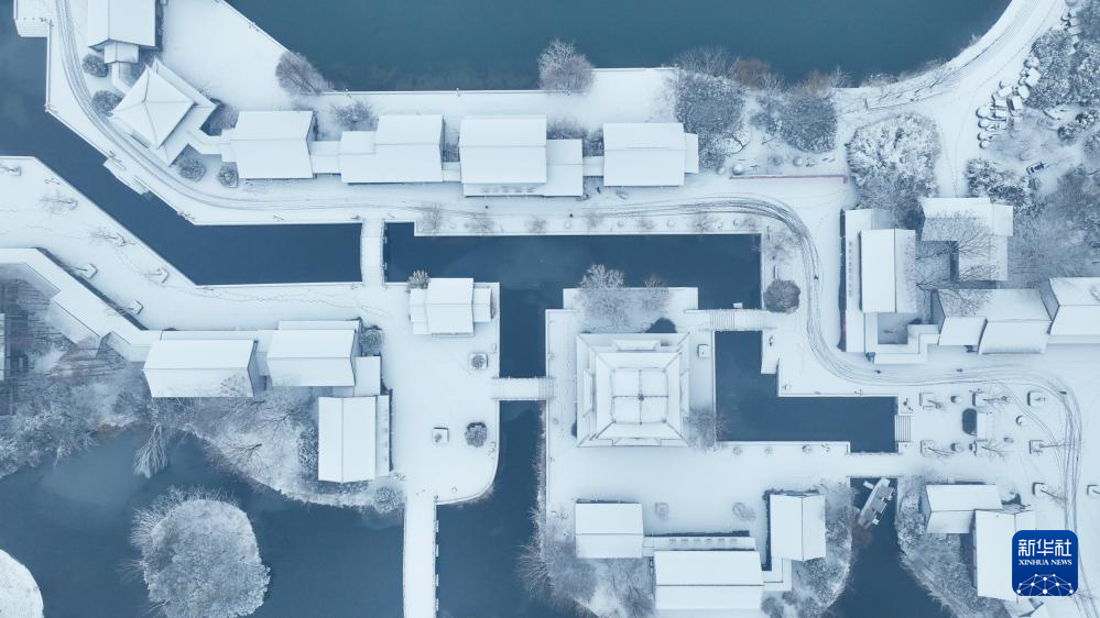 2月4日拍摄的江苏省淮安市洪泽区水釜城雪景(无人机照片)。