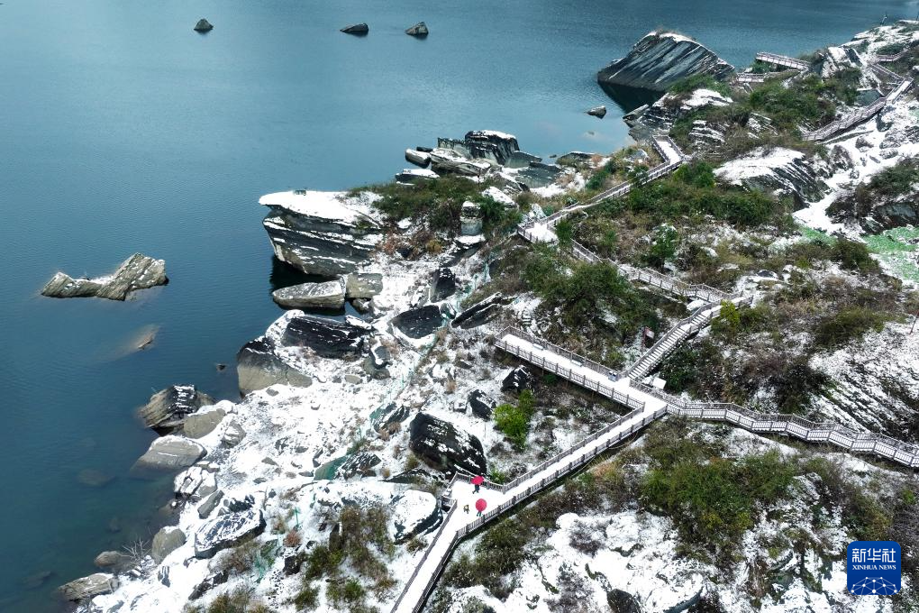 2月4日,游客在重庆市黔江区小南海景区赏雪(无人机照片)。
