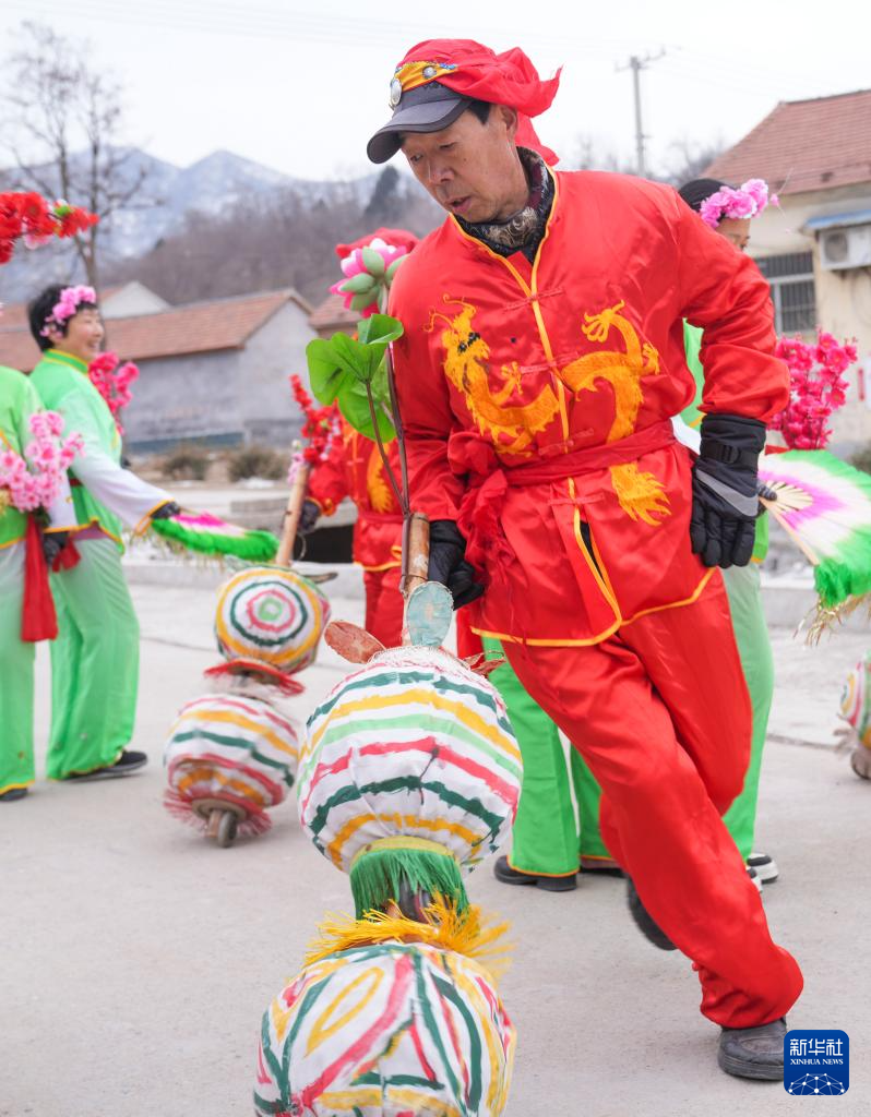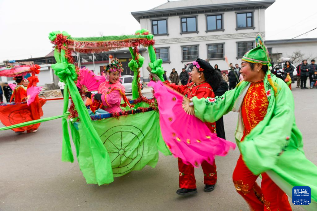 2月4日,河北省遵化市汤泉满族乡关山口村民间艺人在表演太平车民俗节目。