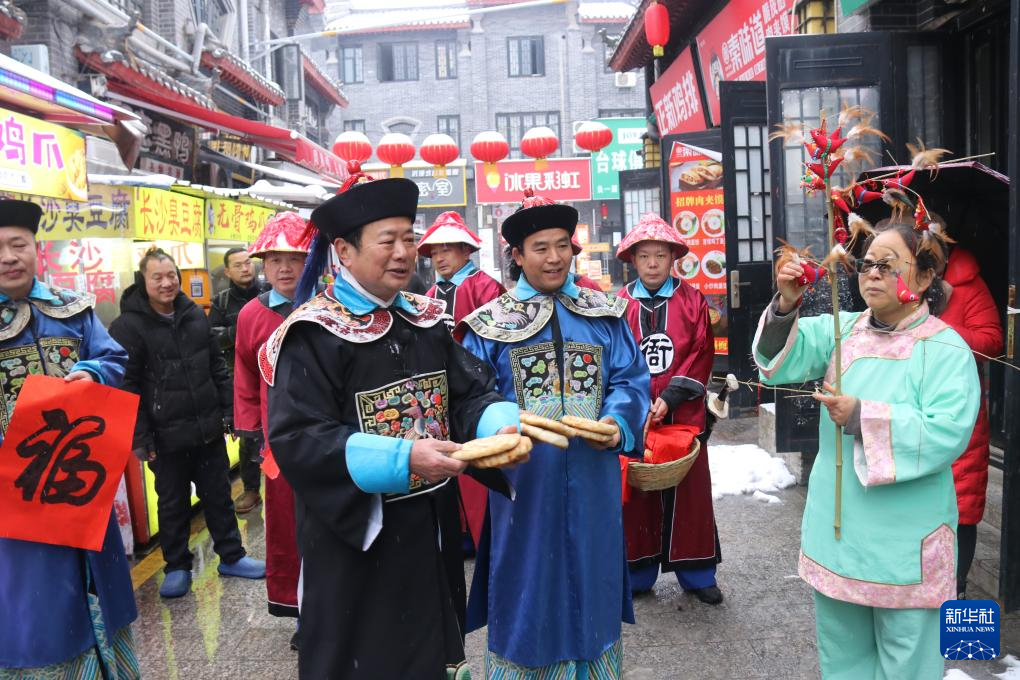 2月4日,在河南内乡县衙举办的“打春牛”系列民俗活动中,工作人员装扮的“县令”在向游客赠送春饼和春鸡。