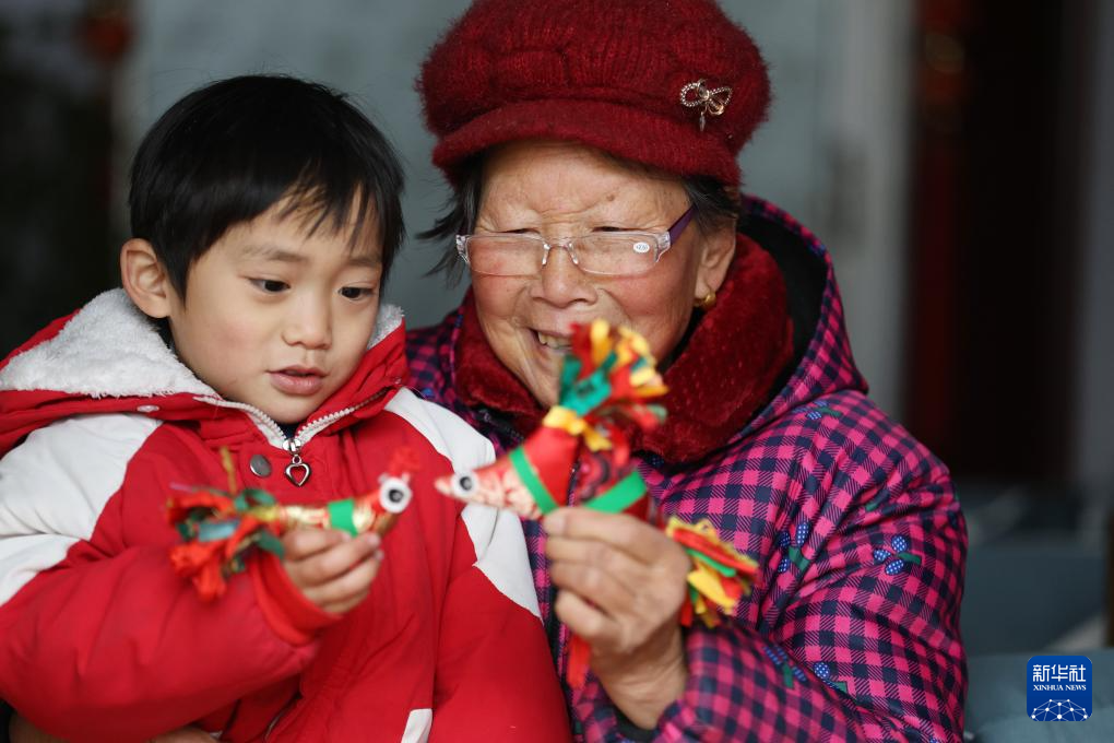 2月4日,山东省临沂市郯城县郯城街道龙泉社区居民为孩子讲解“春鸡”的寓意。鲁南部分地区有在立春日给孩子佩戴“春鸡”的习俗,寓意茁壮成长、吉祥平安。