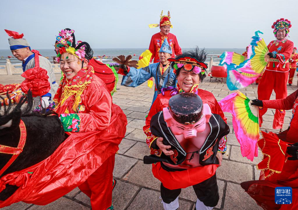 2月4日,在山东省荣成市成山头风景区,民间艺人在进行渔家秧歌、杂耍表演。