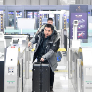 中国旅客莫同辉在中国新疆霍尔果斯公路口岸联检大厅完成查验通过闸机(2月2日摄)。