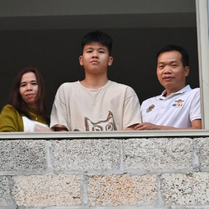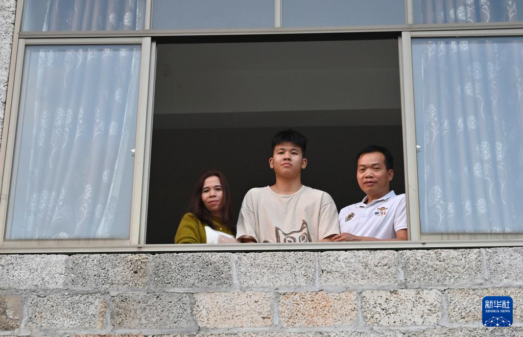 2024年2月2日,在广西靖西市禄峒镇思侯村,周克兵(右)和妻儿站在老家的窗前。