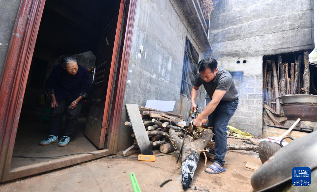 2024年2月3日,在广西靖西市禄峒镇思侯村,周克兵的母亲周母胜(左)在看儿子做家务。