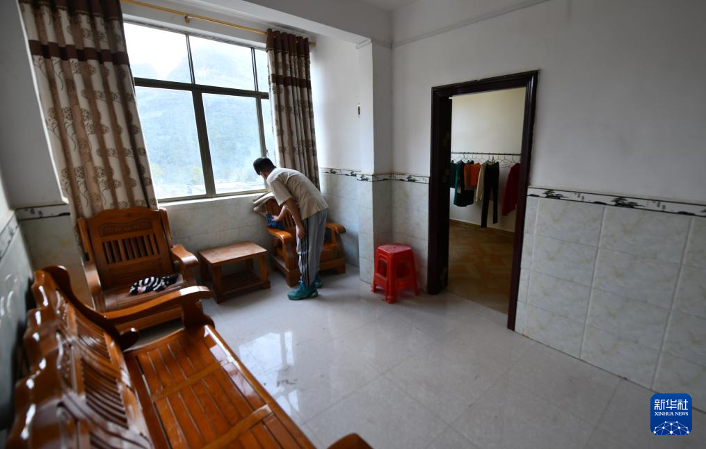 2024年2月2日,在广西靖西市禄峒镇思侯村,周克兵的儿子周福金在家里打扫卫生。
