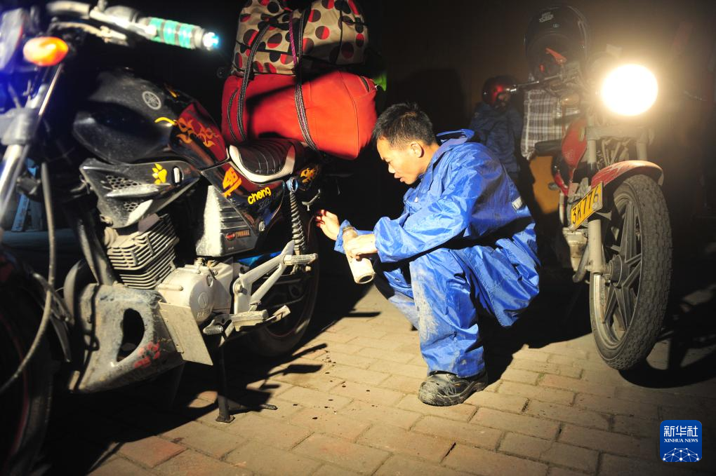2013年2月4日清晨,在广西宾阳县城,周克兵检查摩托车的车况,准备继续上路。