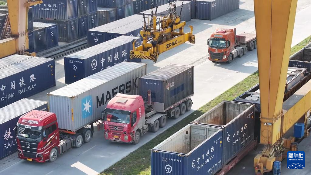 货车在南宁国际铁路港货场中转跨境运输的集装箱(2月2日摄)。