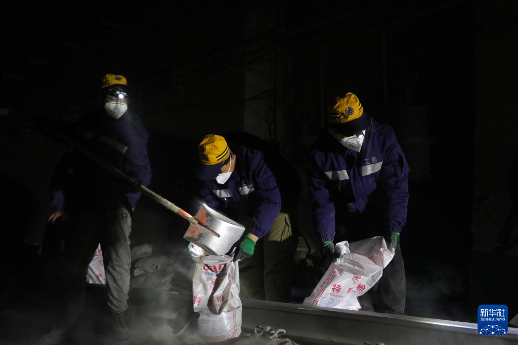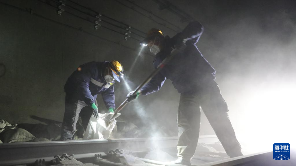 2月5日凌晨,兰州北桥隧养修工区的清沙工人在长寿山隧道进行清沙作业。