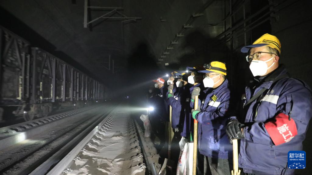 2月5日凌晨,兰州北桥隧养修工区的工人在下行线来车时,停止作业并下道避车。