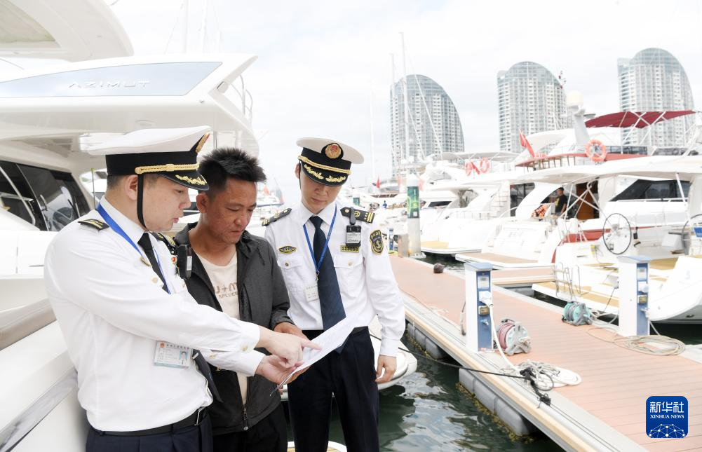 2月5日,在三亚鸿洲游艇码头,三亚海事局执法人员对游艇进行安全检查。
