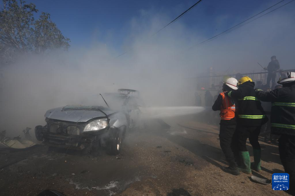 2月4日,消防人员在加沙地带南部城市拉法灭火。