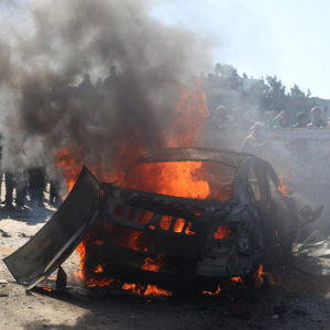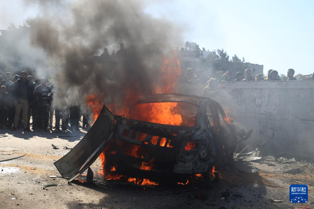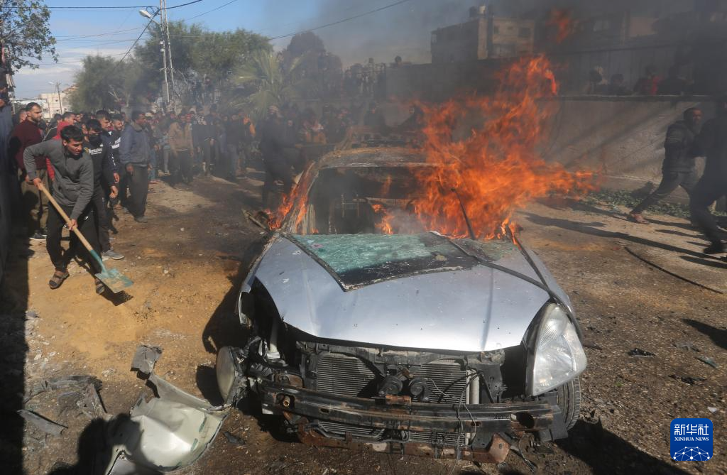 2月4日,在加沙地带南部城市拉法,一辆汽车遭以军空袭后起火。