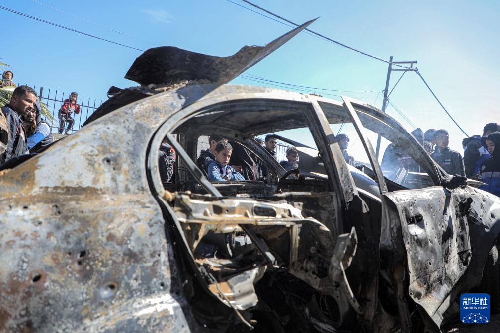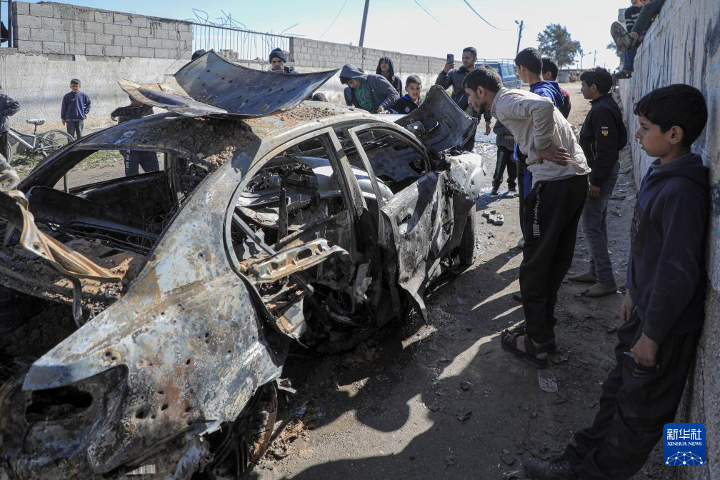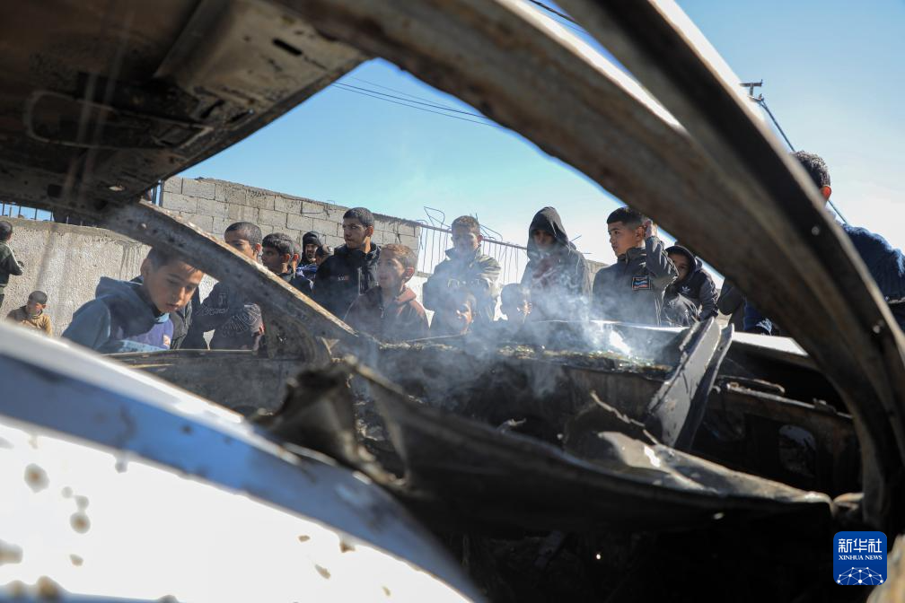 2月4日,在加沙地带南部城市拉法,人们查看遭以军空袭的汽车。