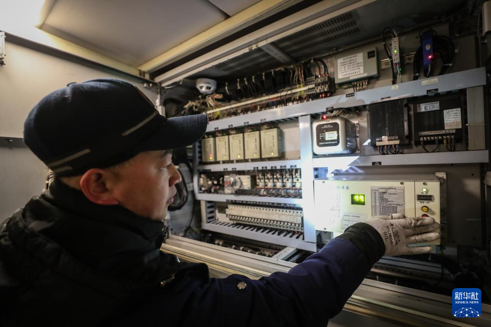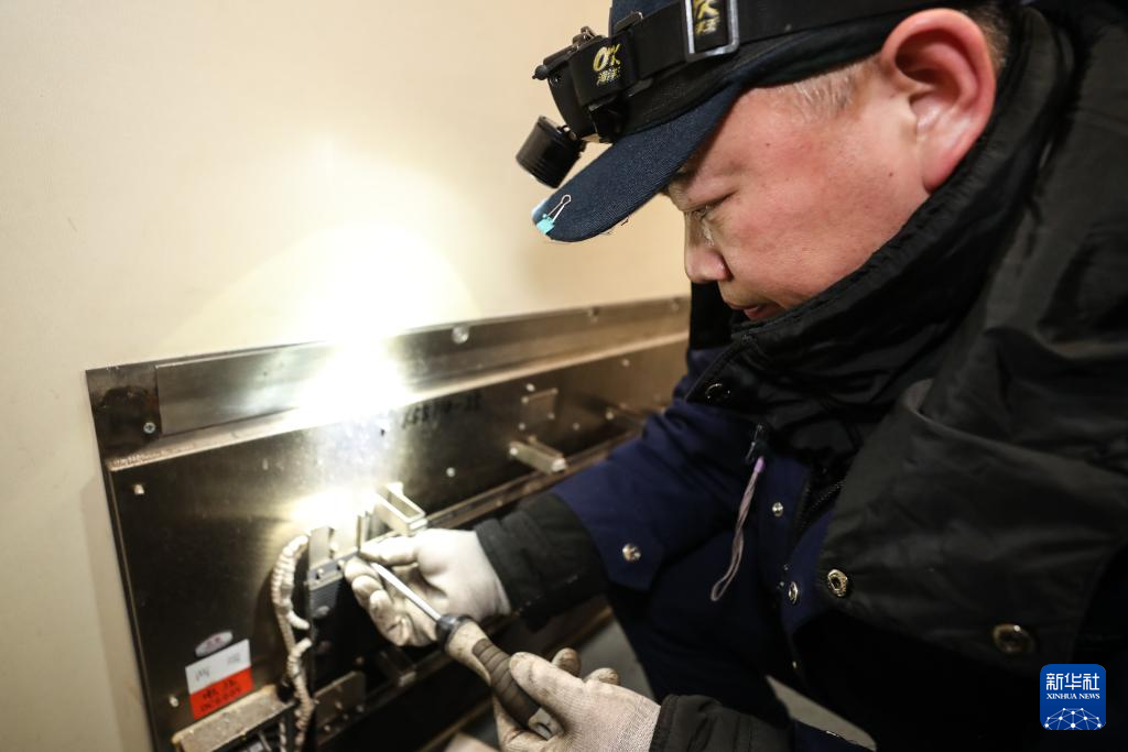 2月5日,田鹤对一列普速列车内的电暖器进行维修。