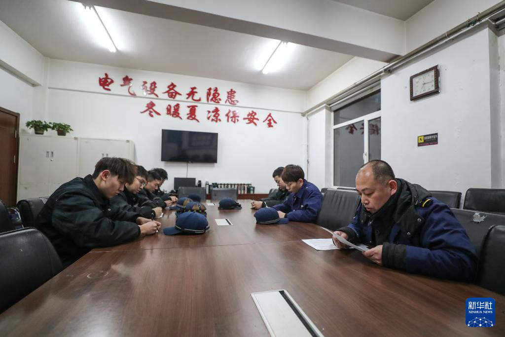 2月4日,开工前,田鹤(右一)与同事进行交班会,安排当天工作。