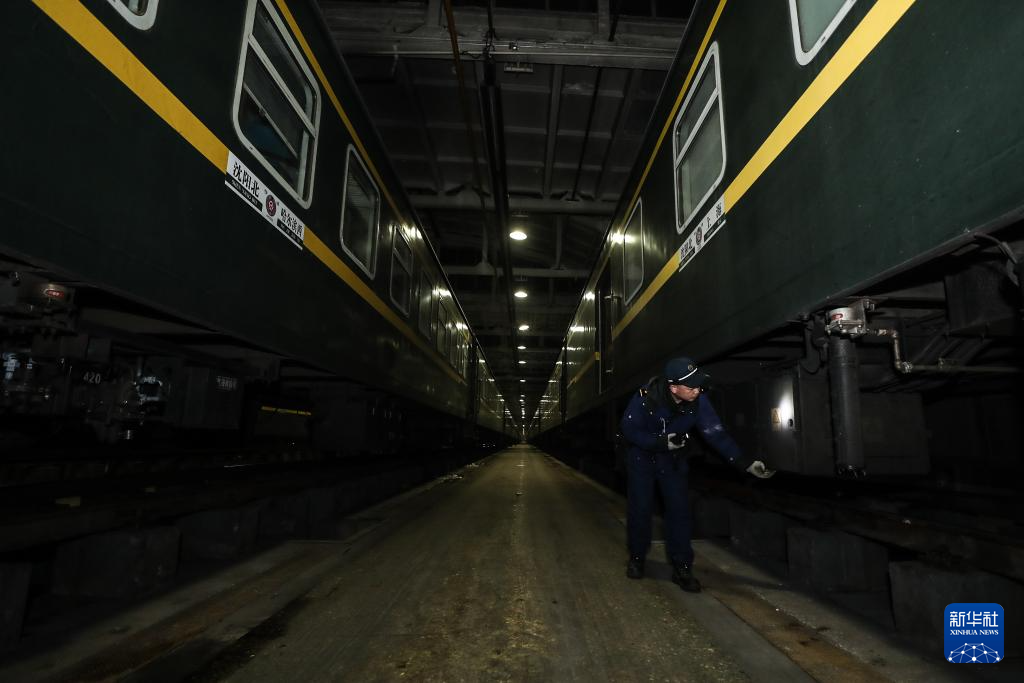 2月4日,田鹤在沈阳车辆段沈阳北整备库内,准备对一列普速列车进行检修工作。