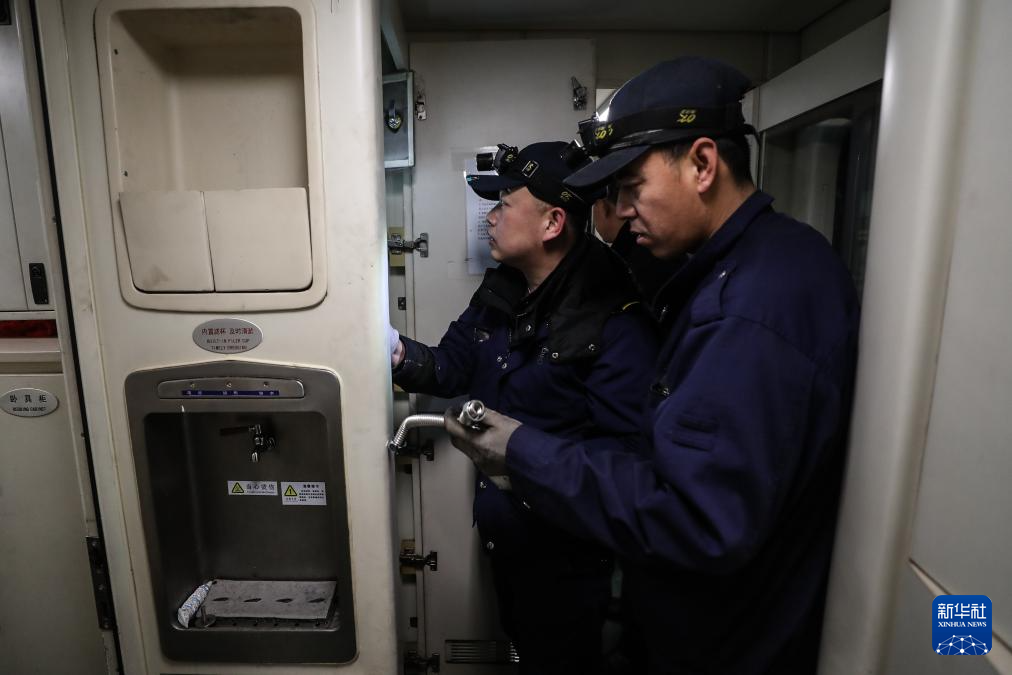 2月5日,田鹤(左)与同事在维修一列普速列车上的电开水炉。