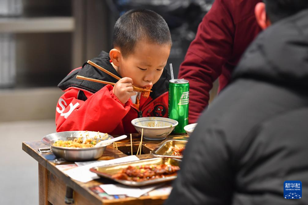 在长沙市天心区裕南街街道的东瓜山夜市美食一条街,小朋友在一家烧烤店用餐(2月4日摄)。
