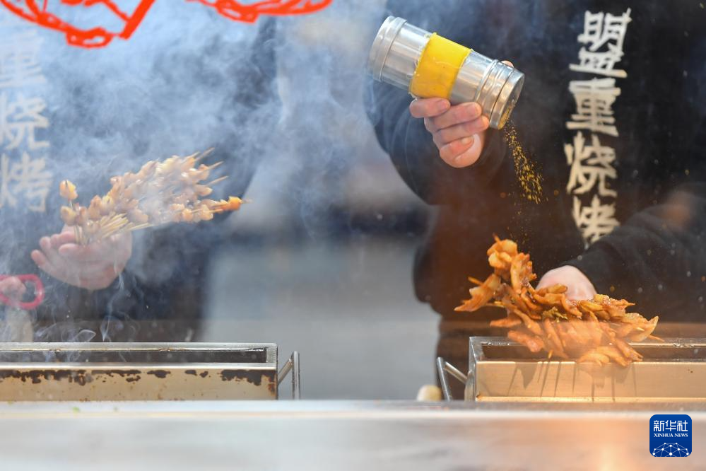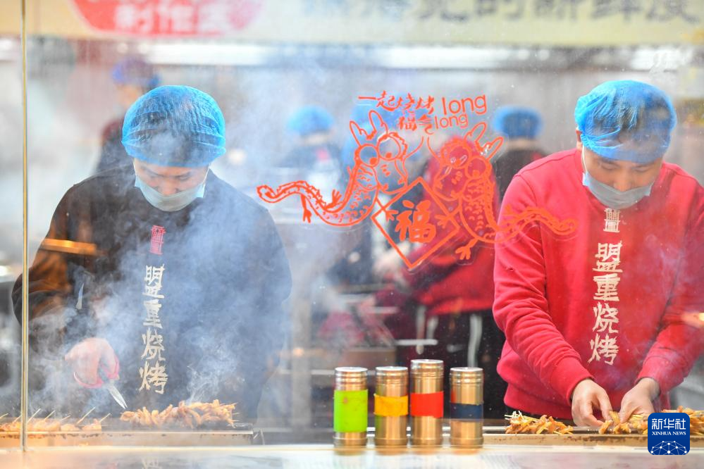 在长沙市天心区裕南街街道的东瓜山夜市美食一条街,一家烧烤店的员工在烤串(2月4日摄)。