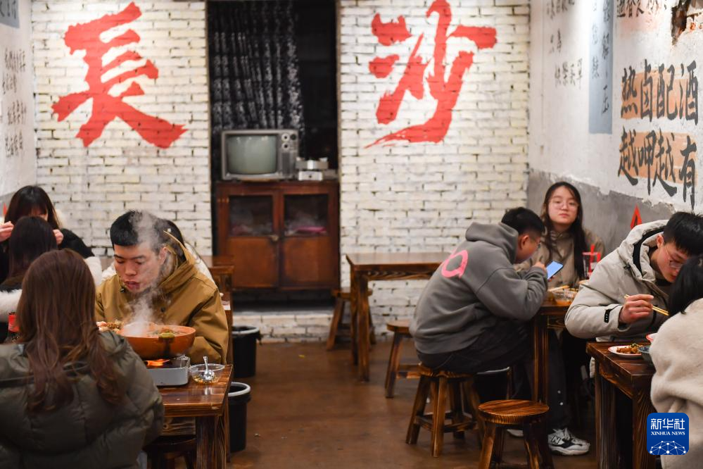 在长沙市天心区裕南街街道的东瓜山夜市美食一条街,食客在一家热卤店用餐(2月4日摄)。