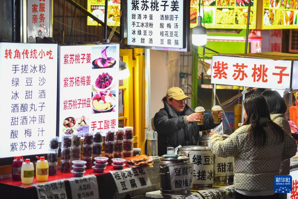 在长沙市天心区裕南街街道的东瓜山夜市美食一条街,食客在一家“小店”购买小吃(2月4日摄)。
