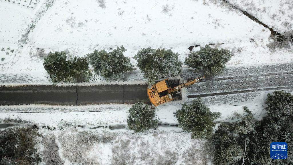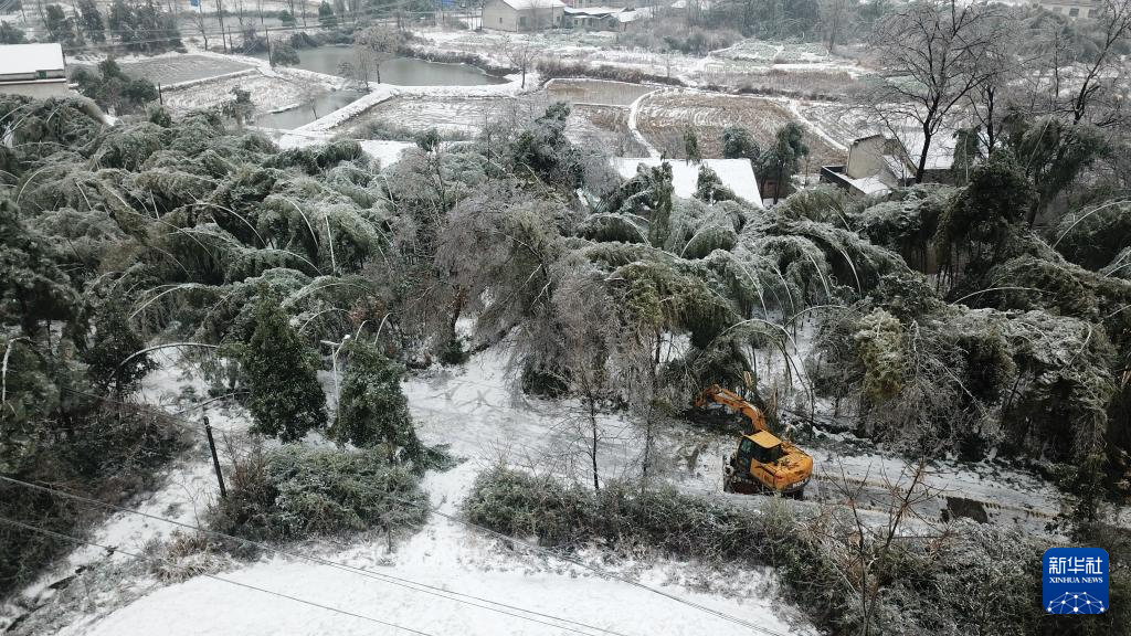 2月5日,挖掘机在湖南省临湘市坦渡镇清理路面积雪与倒伏树枝(无人机照片)。