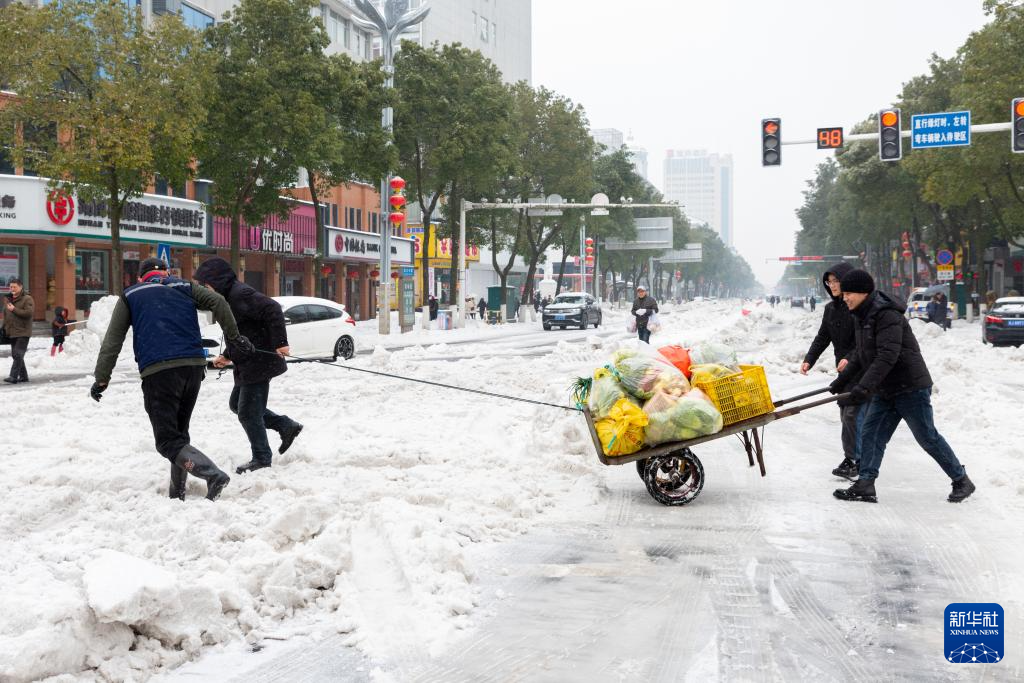 2月4日,在湖南省常德市桃源县漳江街道,志愿者用人力推车为社区居民送去蔬菜。